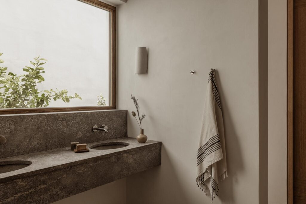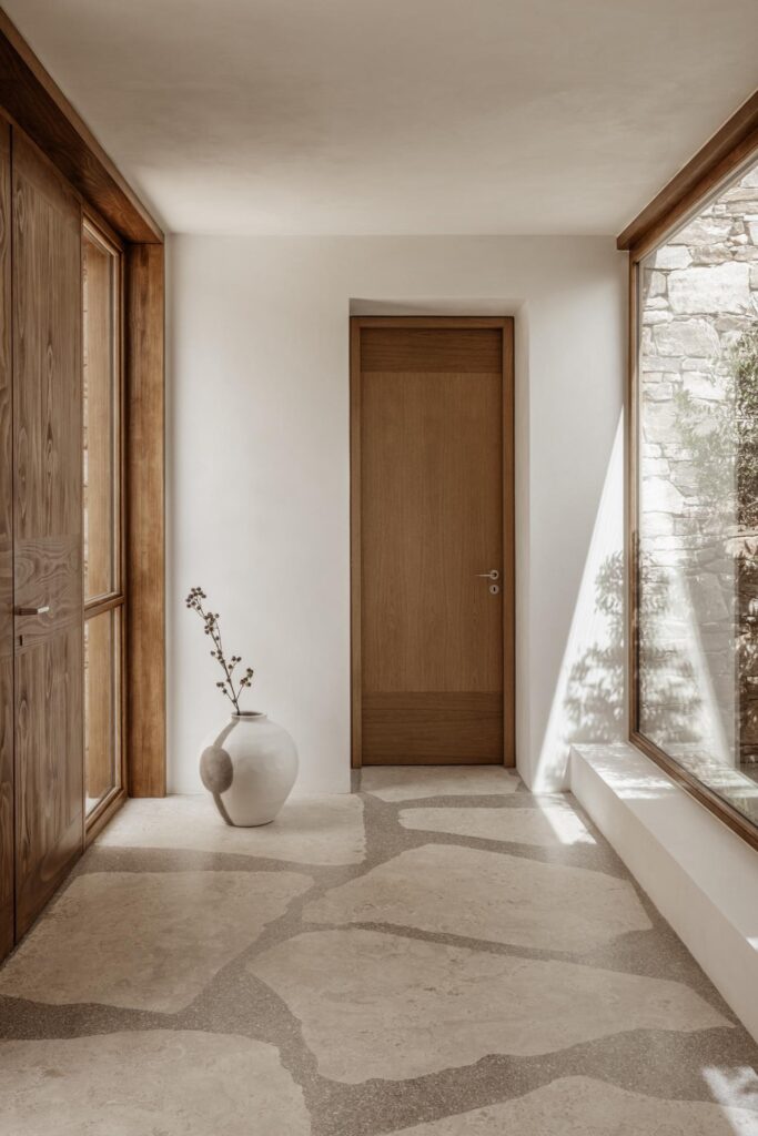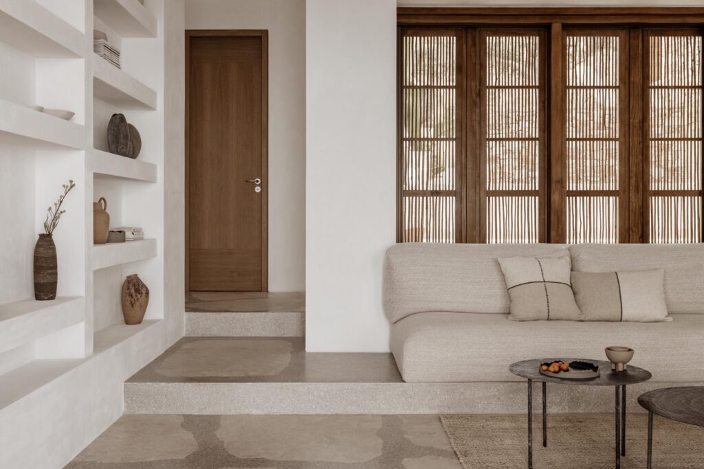 Ev olabildiğine mütevazi bir tavır sergilerken bir yandan da lüks hissiyatını geniş mekanlarında ve el işçiliğinin hakim olduğu detaylarında hissettirir. Olimpos mermeri, traverten taşı, bambu ve meşe ahşap gibi kullanılan karakteristik malzemeler de bu hissiyatı güçlendirmektedir.