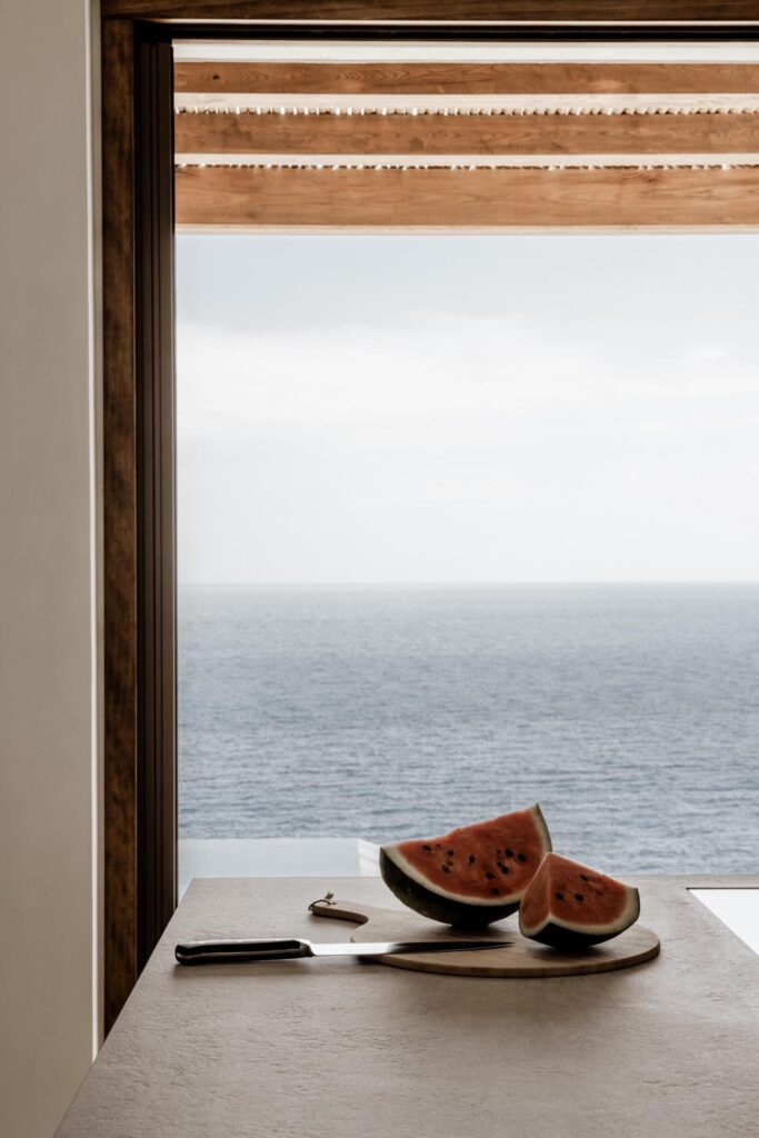 500 metrekarelik alçak, dikdörtgen hacimlerden oluşan kompleksteki birimler; kapalı alanları, terasları, bahçeleri ve avluları birbirine bağlayan bir yürüyüş yolu etrafında düzenlenmiştir. Ana ev, iki yatak odası ve geniş bir yaşam alanını içermektedir. İki misafir süiti ise ek yatak odalarını barındırır ve paylaşılan olanakları ile ana eve bağlı bir planlamaya sahiptir. Ana meydan da tüm birimleri bir araya getirme görevini üstlenir ve ev sakinlerini sonsuzluk havuzu ile dinlenme terasına doğur yönlendirir. 25 metre uzunluğundaki havuz, kesintisiz bir deniz manzarası sunarken aynı zamanda altında spor salonu ve yoga salonunu barındırır.