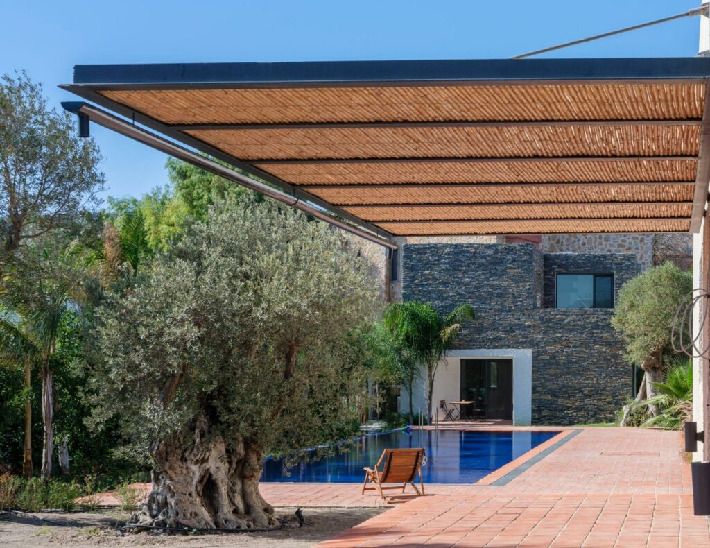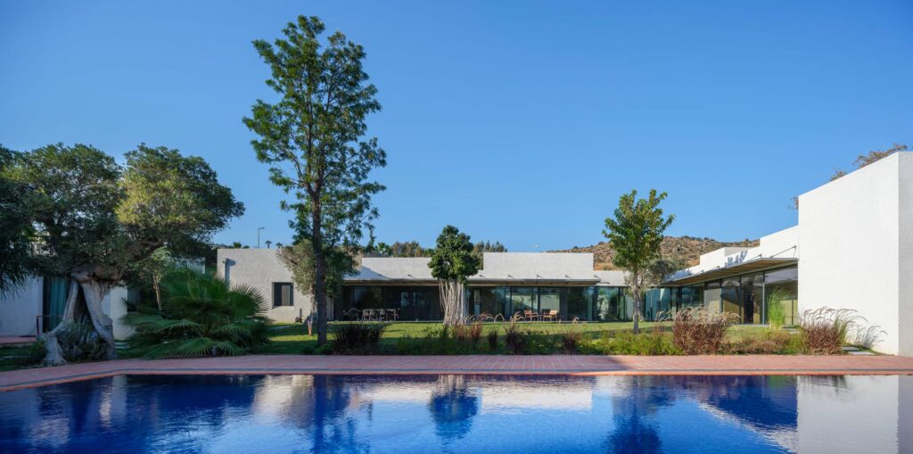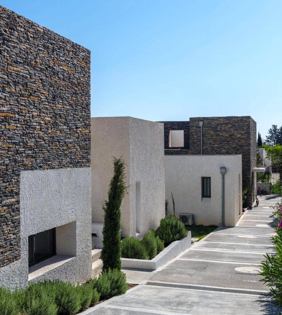 T Evi, Bodrum yarımadasının güney batısında, daha çok kara yerleşiminin olduğu bir bölge olan Ortakent’te (önceki bilinen ismiyle Müsgebi) zamanında yoğun narenciye bahçelerinin bulunduğu bir lokasyonda konumlanıyor. Yaklaşık 4,3 dönümlük proje alanı, 2 ve 2,3 dönüm olarak iki parsele bölünüyor ve bu iki parsel, iki farklı mülk sahibine ait olsa da bütün bir vaziyet planı olarak projelendiriliyor.