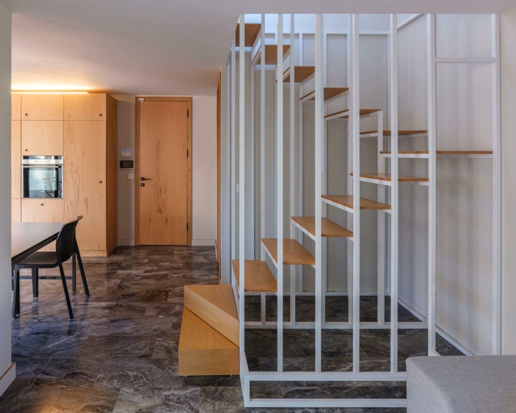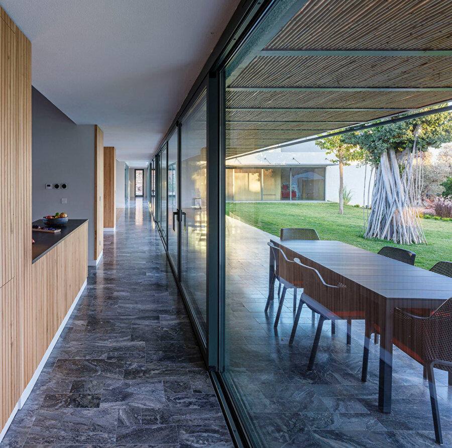 Konut projesinin iç mekanı, dıştan farklı kütleler olarak algılanmasını destekleyerek benimsediği programa göre değişkenlik gösteren iç yüksekliklere sahip. Hacimleri birleştiren yarı açık koridor, avlunun sürekli şekilde iç mekanlardan görülmesini sağlıyor. Koridor boyunca devam eden geniş açıklıklar, avlu ile görsel temas sağlamasının yanında kesintisiz fiziksel erişim sunuyor.