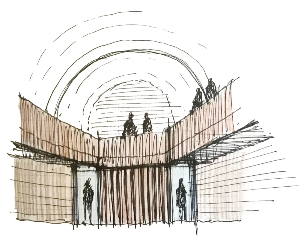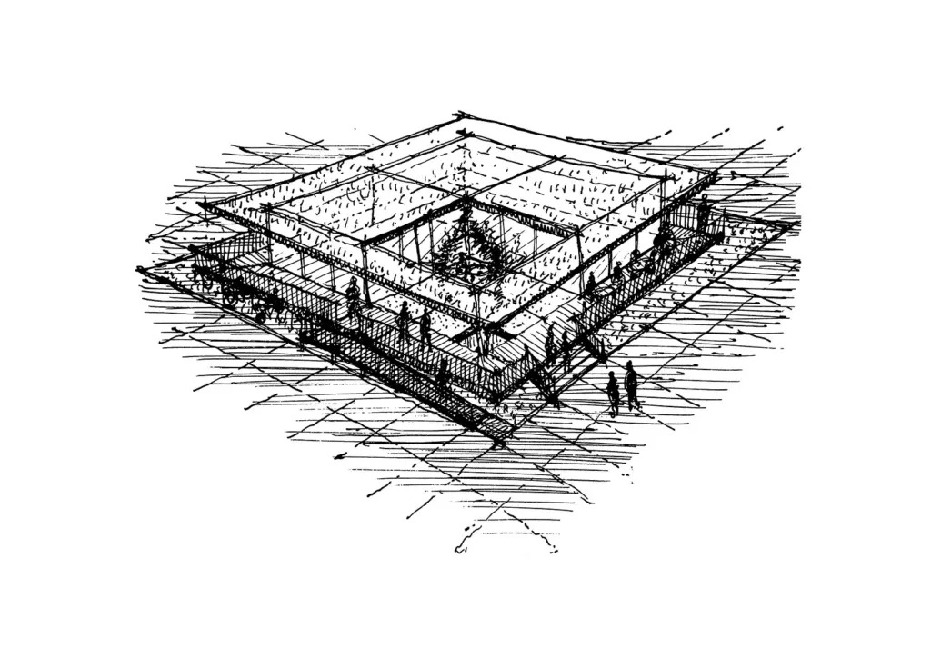 Restorasyon projesi kapsamında dört adet yapının çevrelediği avlunun geometrik merkezine bir pavilyon yapısı önerilmiştir. Söz konusu pavilyon gerek otopark, gerekse Millet Bahçesi tarafından avluya giren kullanıcıları kendine çekecek, ardından da bir tür merkezkaç kuvveti ile yeniden işlevlendirilmiş tarihi yapılara dağıtacak bir odak noktası olarak düşünülmüştür. Bahsi geçen merkezkaç kuvveti, yapının çevresini dönerek çatıya ulaşan bir rampa vasıtasıyla da cisimleşmektedir. Söz konusu çatıdan Hünkar Köşkü ve Marmara Denizi seyredilebilmekte, bu da ziyaretçilerin içinde bulundukları bağlama dair algılarını kuvvetlendirmektedir. Kafe olarak düşünülmüş yapıda farklı açık, yarı açık ve kapalı mekan kullanımlarına imkan verilmiş olması, pavilyonun değişken iklim koşullarında kullanılabilmesini de olanaklı kılmıştır.