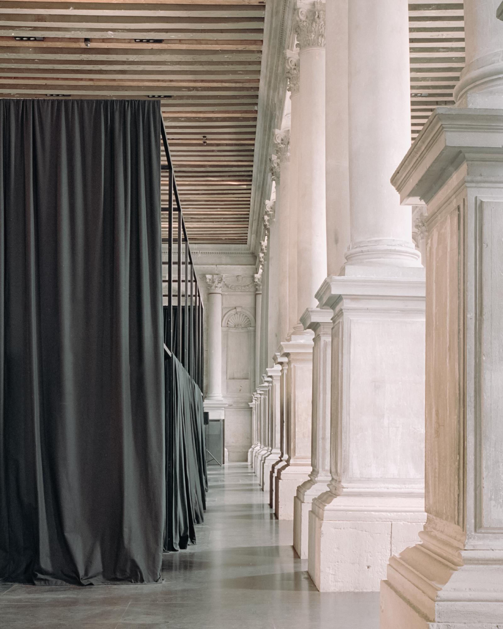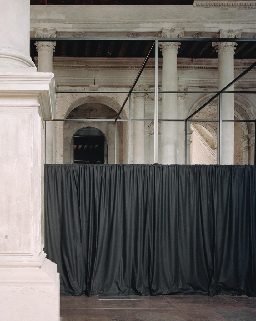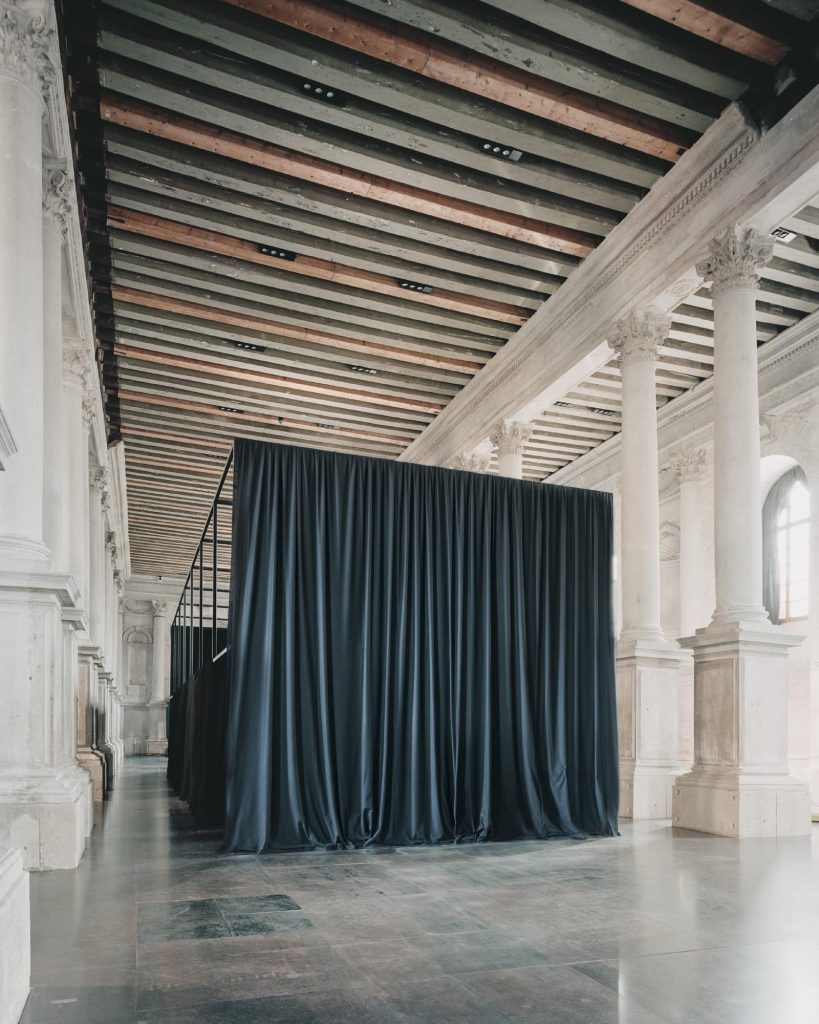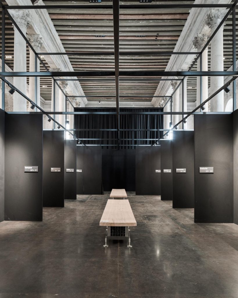 Ahşap içi boş paneller üzerine gerilmiş kumaşla kaplı sergi, siyah perde ile gizlenerek ziyaretçileri benzersiz bir deneyime davet ediyor. Yüksek tavanlı tarihi mekanın sütunlarının arasındaki pavyon, yeni, sade ve soyut bir hacim olarak dikkat çekiyor.