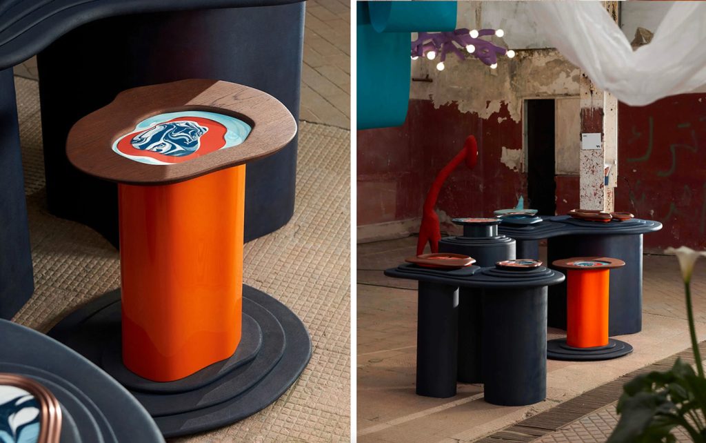 Ka’ve 08 ve Ka’ve 09, geleneksel iç içe geçen sehpa tipolojisinden ilham alan, birlikte ya da ayrı kullanılabilen iki parça olarak tasarlanmış. Masif ceviz ağacından üretilen gövdeler, parlak lake tepsi yüzeyleri ve bakır kaplama pirinç çerçeve detaylarıyla tamamlanıyor.