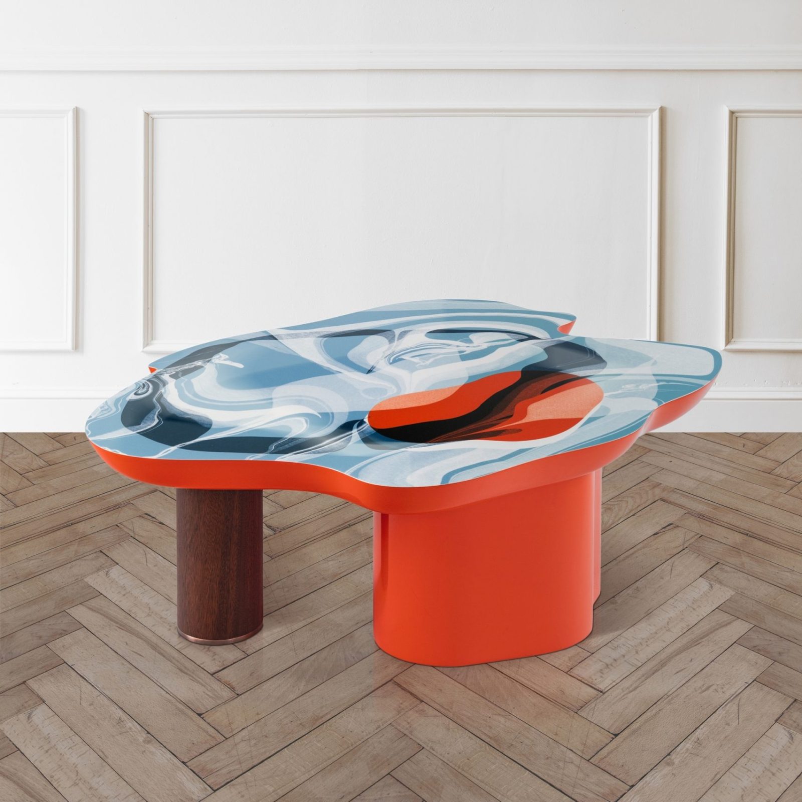 Ka’ve 01, kurucu ortak Eda Akaltun’un akıcı sanat eserlerinden ilham alan formu ile serinin en karakteristik parçalarından biri. Parlak lake masa tablası, heykelsi vurgulu ayaklarla dengelenirken; masif ceviz ağacından üretilen ayaklar, bakır kaplama pirinç detaylarla zenginleştirilmiş.