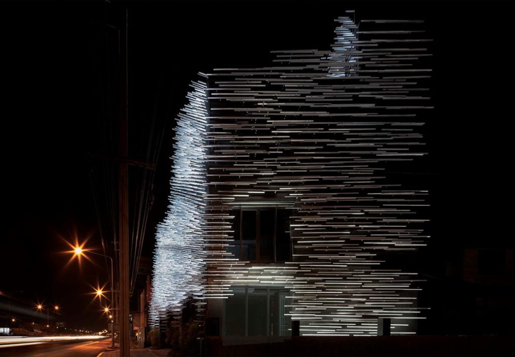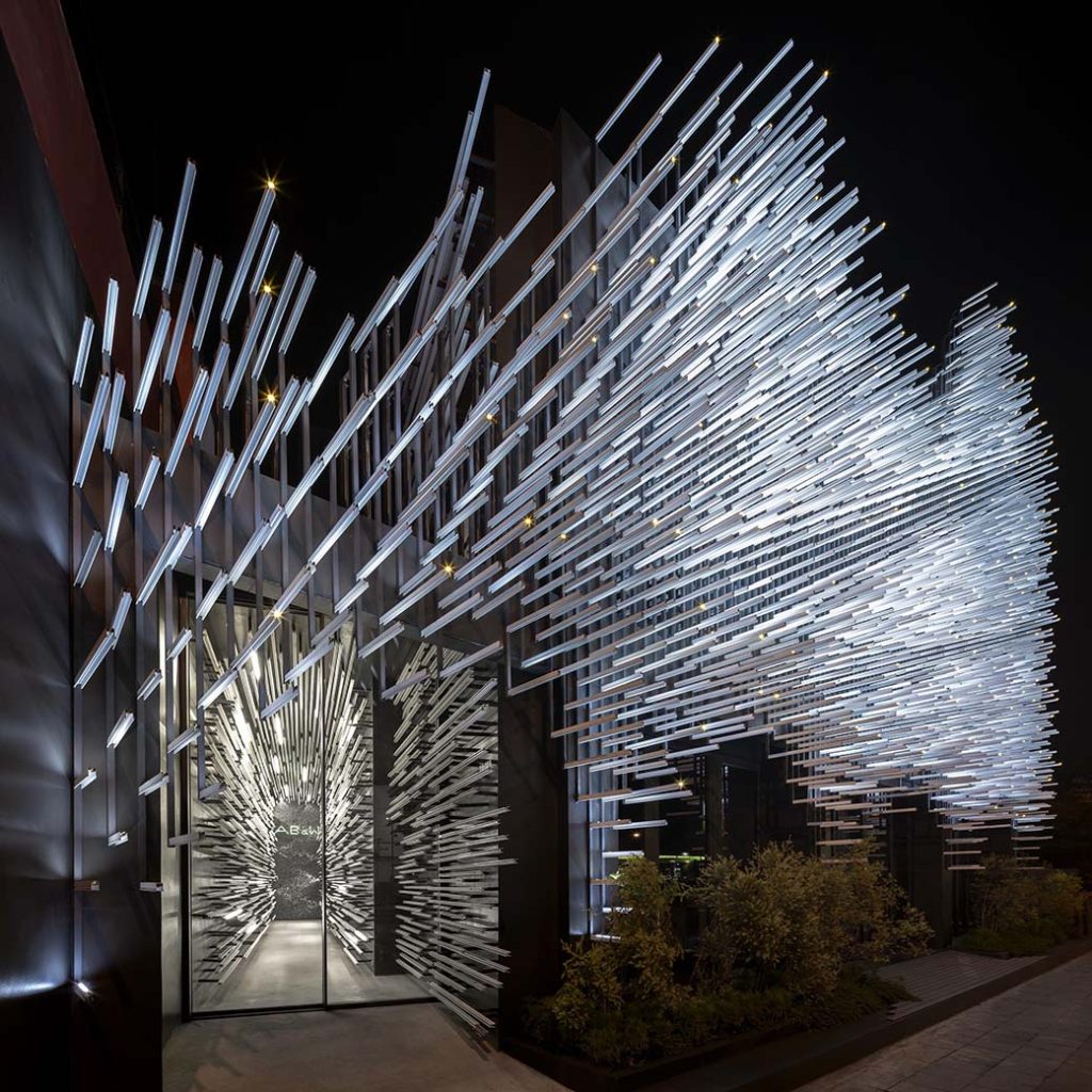 Dış cephe, tıpkı bir karahindibanın tohumları gibi her biri farklı renk ve dokuya sahip on binlerce alüminyum şeritle kaplanmış. Alüminyum şeritler, LED aydınlatma ile ön cepheden iki yan cepheye uzanıyor ve batı tarafındaki bir ‘tünel’ alanı aracılığıyla doğrudan iç mekâna kadar devam ediyor. Cephede kullanılan katmanlı metal aynı zamanda iç mekanları serin tutmak için bir gölgeleme elemanı olarak da işlev görüyor. En üst kattaki kapalı peyzaj, mevsimlik bitkilerle yüzen bir adayı andırıyor ve ateşböceklerinin gelişmesi için kentsel bir ekolojik alan yaratıyor.