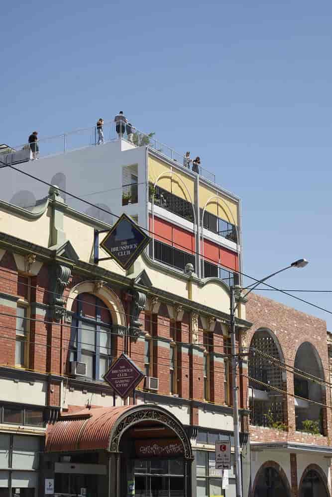 Terrace House’un sokak cepheleri bölgenin zengin ve farklı unsurlardan meydana gelen mirasına bir yanıttır. Projenin konumlandığı Brunswick’te savaş sonrası Akdeniz-Avusturalya mimarisinin birçok örneğinin yanı sıra endüstriyel binalara ve Viktorya dönemine ait büyük dükkan cephelerine rastlanmaktadır. Terrace House, bu çok sesli bağlamdan saygılı ve eğlenceli izleri modern bir yorumla kendi cephesine yansıtır. Geri dönüştürülmüş tuğlalar bölgenin endüstriyel geçmişine gönderme yaparken uzun boru şeklindeki çelik kemerler de çevredeki unsurlara atıfta bulunmaktadır.