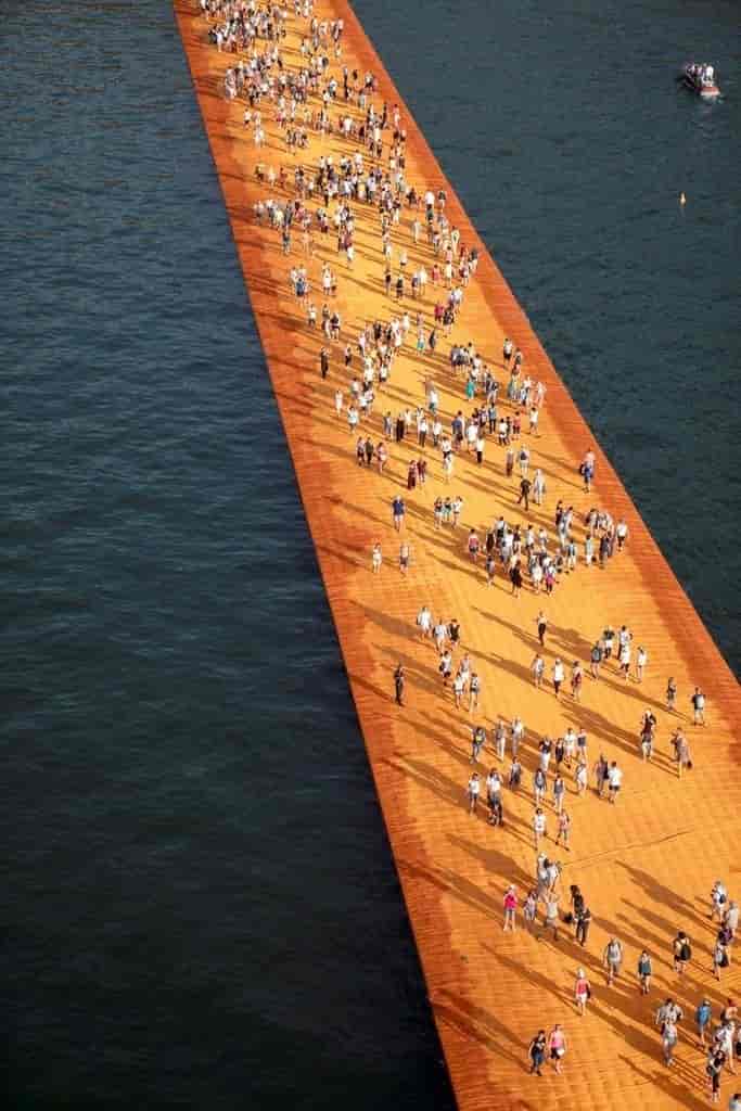 Ziyaretçiler The Floating Piers’ta Sulzano’dan başlayıp gölün üzerinden Monte Isola Adası’nın doğu ucuna dek yürüyebiliyorlar. Modüllerin üzerini kaplayan parlak sarı-turuncu renkli kumaş diğer uçta Sulzano’nun caddelerine kadar 1.5 kilometre daha devam ediyor. 200.000 adet yüksek yoğunluklu polietilen küpten oluşturulan modüler sistem dalgalar ile birlikte hareket edecek şekilde tasarlanmış. 16m genişliğinde olan iskele su seviyesinden yaklaşık olarak 50cm yukarıda yer alıyor ama kenarlarda kumaş nazikçe suya doğru alçalıyor ve su ile bütünleşiyor.