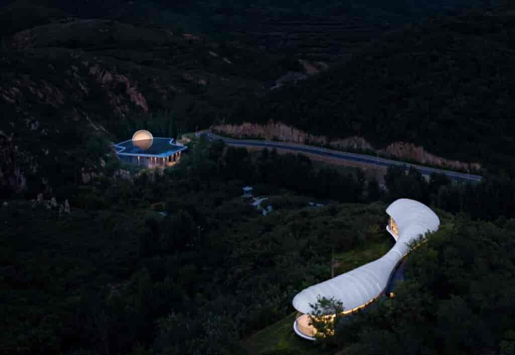 Proje, Hometown Moon ismini aya olan bu benzerliğinden alıyor. Gad Line+ Studio imzalı bulut formlu Jiunvfeng Study seyir terasının karşısına inşa edilen proje, var olan yapı ile güçlü bir ilişki ortaya koyuyor. Eğrisel formlar ve açık tonlar, pek de yakın sayılmayacak bu iki yapıyı birbirinin devamıymış gibi hissettiriyor. Syn Architects’in iki yapının ilişkisiyle ilgili açıklaması şöyle: ‘Binalar sembolik karşılıklar olarak birbirini tamamlıyor… bir dağı, bir nehri geçip birkaç kavisli yolu keşfettikten sonra, ziyaretçiler nihayet binaya varıyor.’