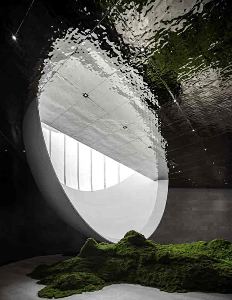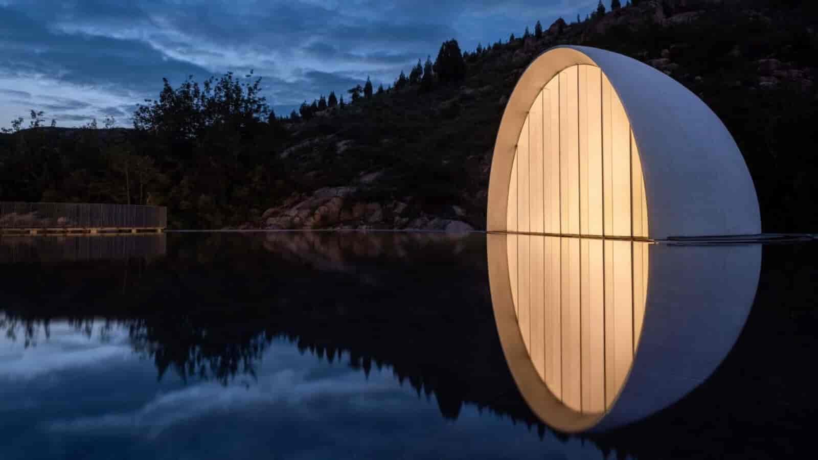 Salonun çatı düzlemini kesen yarı küresel form, dramatik bir şekilde aydınlatılarak yansıtıcı yüzeyin de etkisiyle yapının görsel algısını oldukça farklılaştırıyor. Çatıdaki ince su birikintisi uzaktan dolunay benzeri bir yansıma yaratıyor. İç mekanda da kürenin altta kalan diğer yarısı görünüyor ve yine yansıtıcı tavan malzemesi sayesinde yarım küre bütün bir form gibi algılanıyor. Işık, yansıma ve gölge oyunlarıyla dolu bu tasarım, çevresindeki doğanın büyüleyiciliğine ve iç mekanda yaratılmak istenen maneviyat dolu, sakin atmosfere vurgu yapıyor.