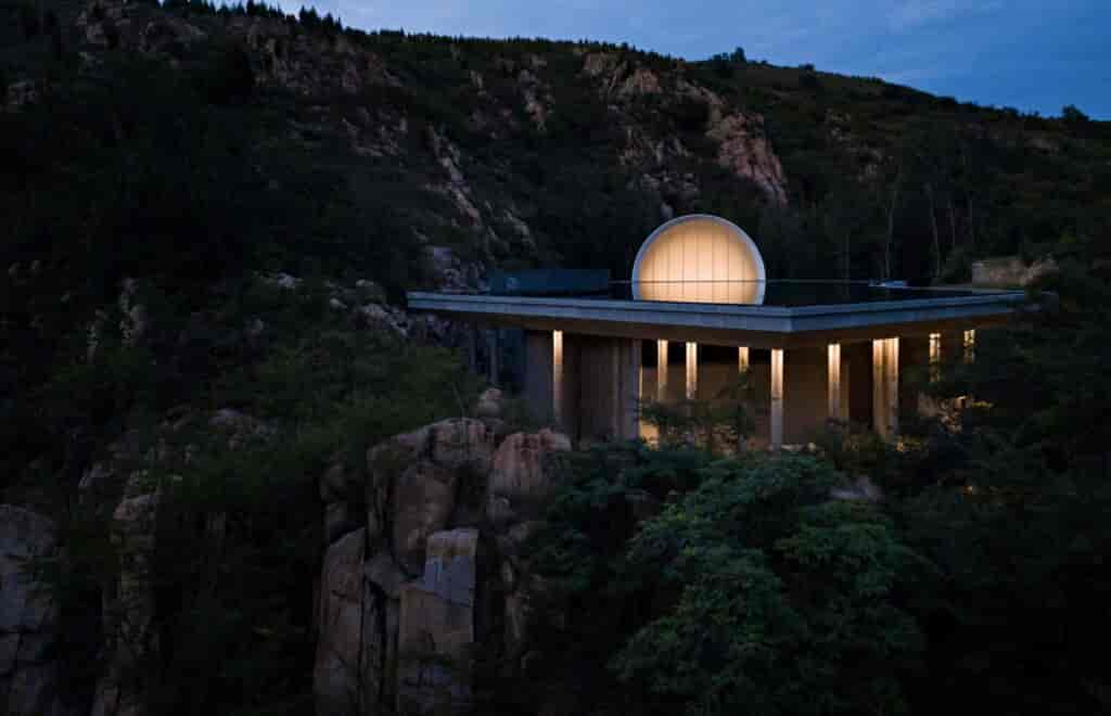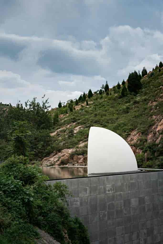 Yapı, etrafındaki nefes kesici manzaradan ve çevrede baskın bir unsur olan Tai Dağı’ndan oldukça etkileniyor. Çıplak bırakılmış beton duvarlar ve zeminler, taş objeler, zemindeki kaya benzeri formlar, tasarımı neredeyse dağın bir parçasıymış gibi hissettiriyor. Uyum, kalıcılık, sonsuzluk gibi Budizm’in temel düşüncelerinden ve Taoizm’den gelen boşluk kavramlarından izler barındıran tasarım, mimari bir yapı olmanın ötesinde şiirsel ve felsefi bir duyarlılık da taşıyor.