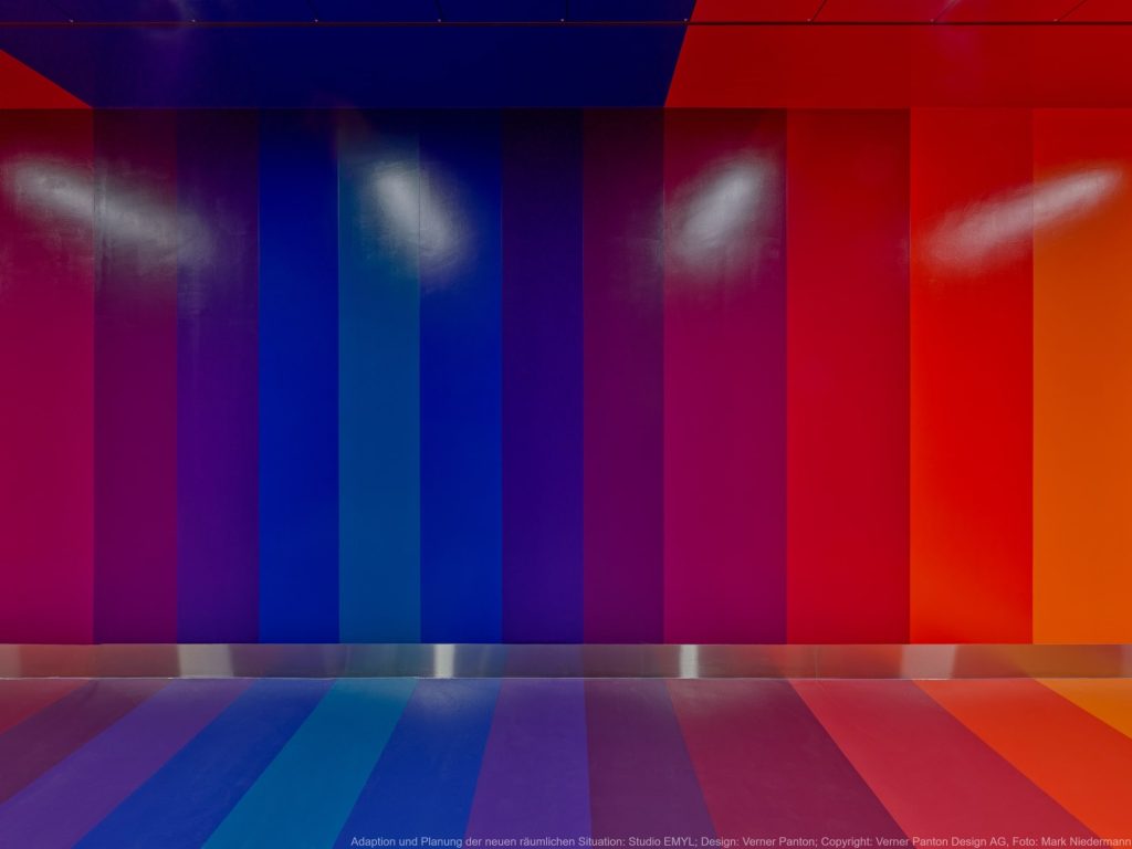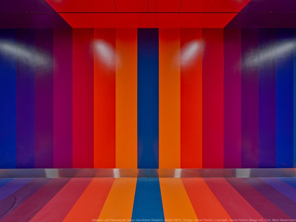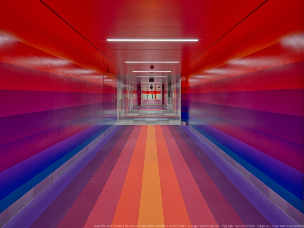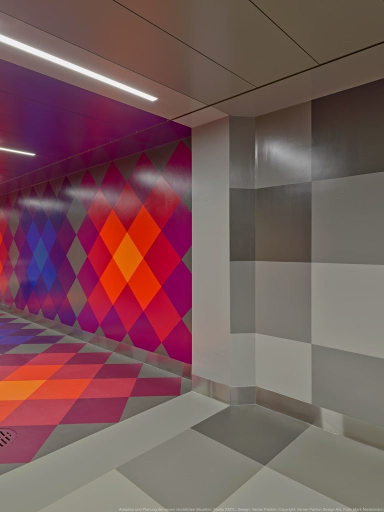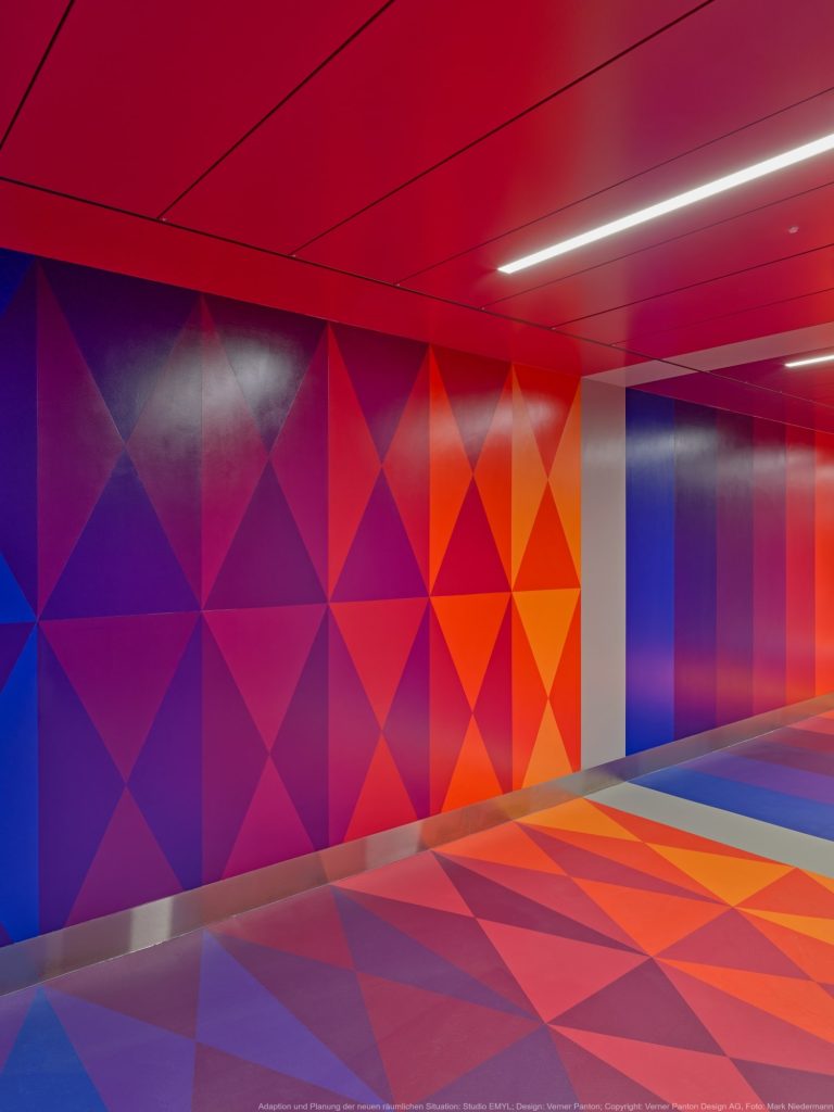 1978 yılında tasarlanan orijinal Pantongang, gri ve turuncu, kırmızı ve mordan koyu laciverte kadar uzanan çizgilerle kontrast oluşturan, geometrik desenlerin ahengini sergileyen özgün bir iç mekân tasarımı. Yeni koridorda bu tasarım dili korunurken, boyutlarındaki farklılık nedeniyle sekiz temel ton ve yedi gri tonunda tasarlanan bireysel desen dizileri kısaltılmış. Panton’un ilk tasarımındaki gibi, zemin alanı da renkli ve dinamik bir tasarıma sahip. Bu detay, Panton’un vizyonuna duyulan saygının bir göstergesi niteliğinde.