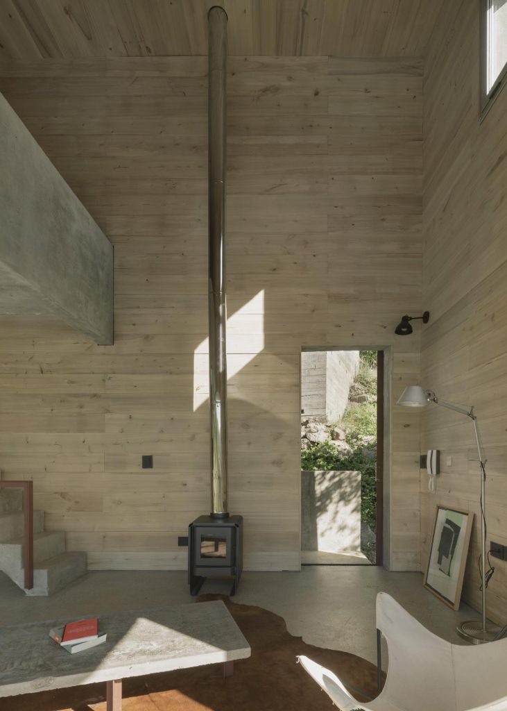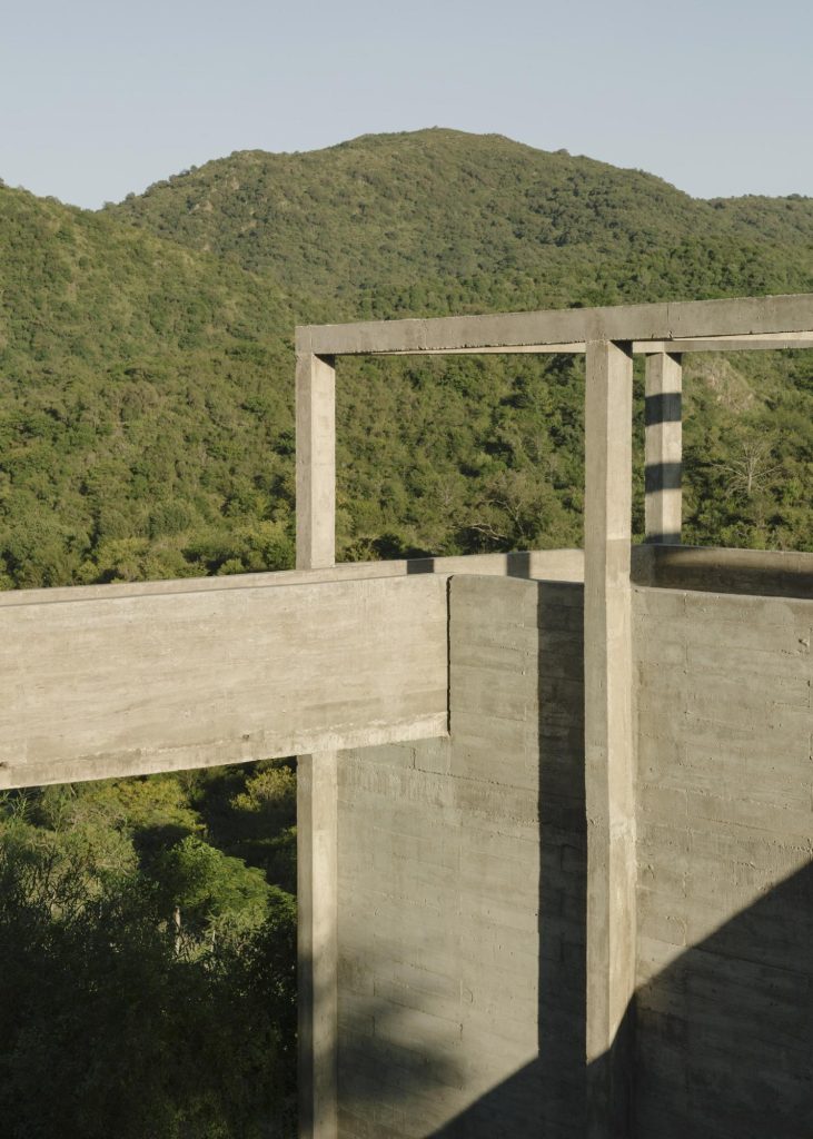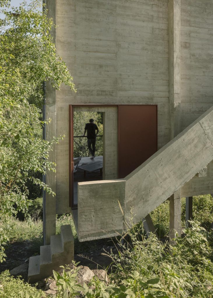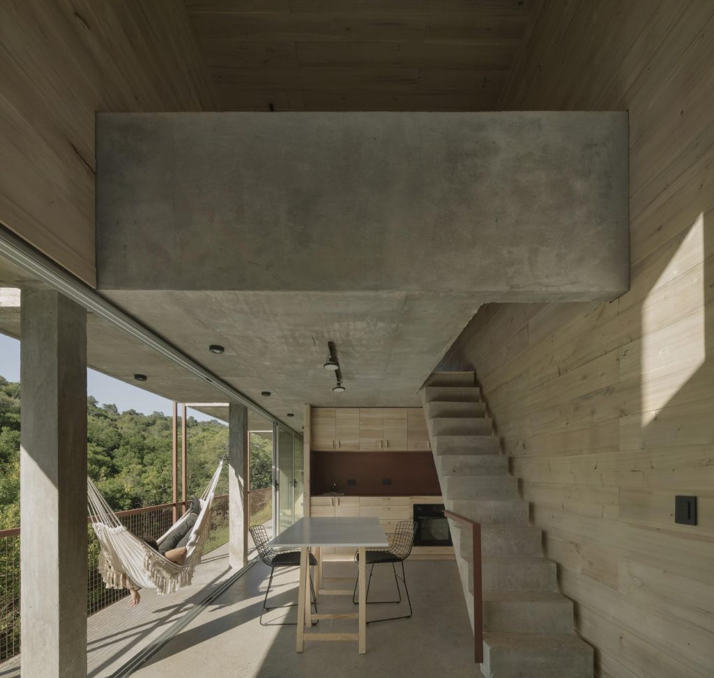 Tasarım, doğal topografyayı bozmamaya özen gösterirken iç-dış, özel-açık gibi farklı tipte mekanlar önerir. Aynı zamanda, hava ve su evin altından akıp gitmeye devam eder.