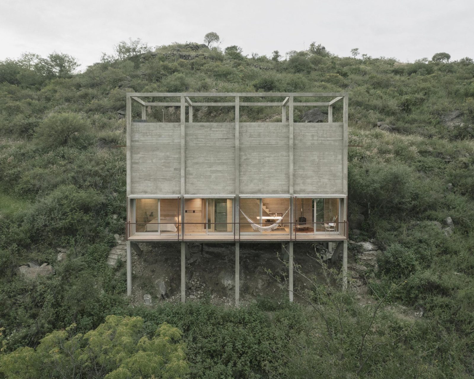 Arjantin, Córdoba yakınlarında Agustín Berzero ve Manuel González Veglia tarafından tasarlanan ‘Workshop House’, yaşamak, çalışmak ve yazı yazmak üzere sakin bir ortamda hayata geçirilmiş bir projedir. Kimi özellikleriyle doğayla bütünleşirken kimi yönleriyle de ondan oldukça ayrışan bu ev , birbirini tamamlayan zıtlıklar üzerine kurgulanmıştır. Yapının alt kısmı ağırken, üst kısım hafiftir. Desteklere hemen hemen hiç yüklenmez. Açıkken manzarayı yakalayıp güneşi içeriye davet eden tasarımı gerektiğinde içe dönük bir bakış açısıyla tamamen kapanabilecek şekilde düşünülmüştür. Projenin çatısı, manzarayı bozmamak için arazinin en yüksek noktasını aşmayacak şekilde planlanmıştır ve yapıya bu çatıdan erişilebilmektedir. Çatıdan başlayan yolculuk düşünsel bir tavırla alt kısma doğru ilerler ve böylece doğal dokuya ulaşılır.