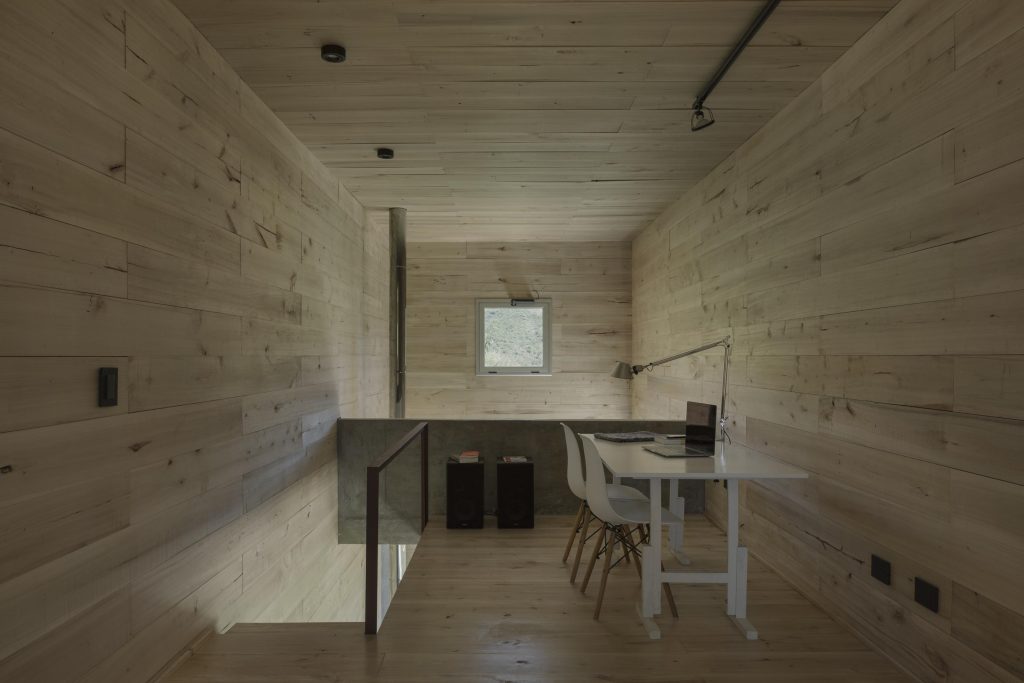 Yaşama, yemek yeme, pişirme ve uyuma için kullanılan ana alan, ağaçların seviyesindeki manzara ile bağlantılıdır. Buna karşılık, açık planlı içe dönük bir asma kat, bütün boşluğun üzerinde asılıdır ve iç mekanda heykelsi bir etki yaratır. Alttan aydınlatılan bu alan, içe dönük bir ortam yaratır ve dış dünyadan kopuk bir şekilde yazma ve okuma için bir yer sunar.