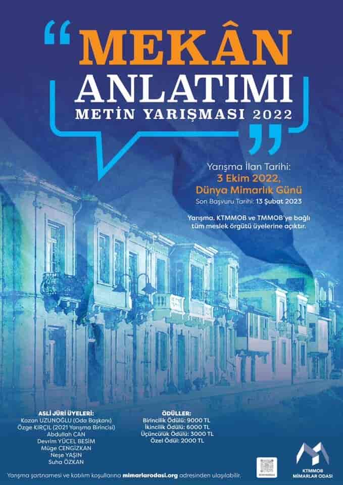 Yarışma hakkında şartname ve başvuru formuna ulaşmak için; https://www.mimarlarodasi.org/tr/odamiz/oda-aktiviteleri/mekan-anlatimi-metin-yarismasi-2022.html