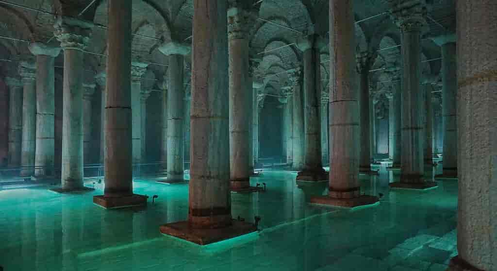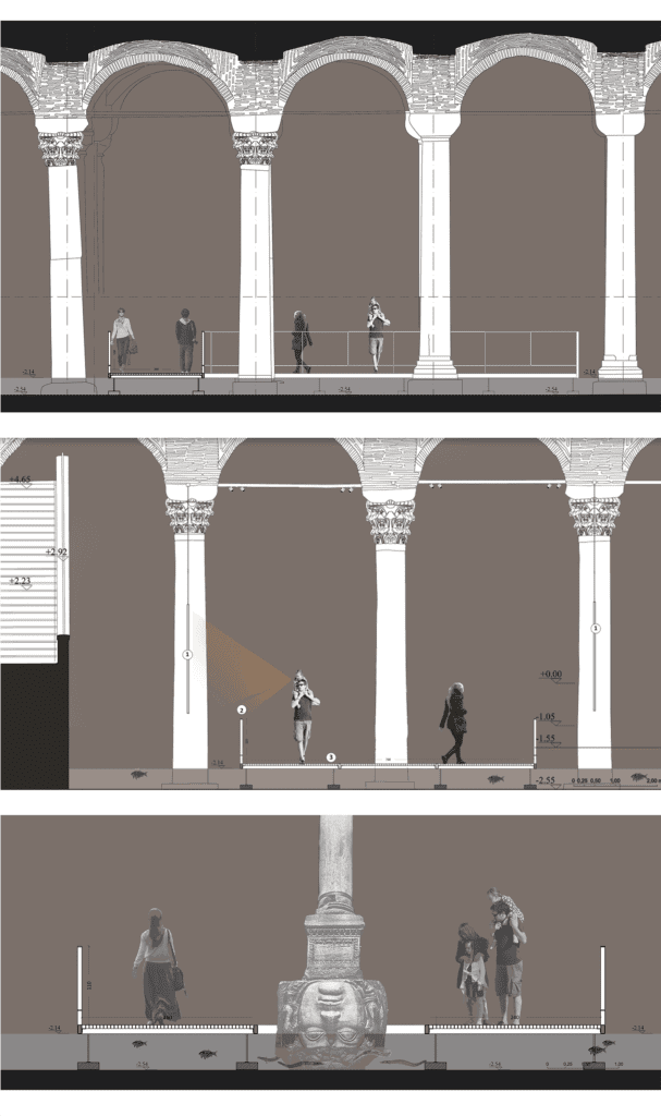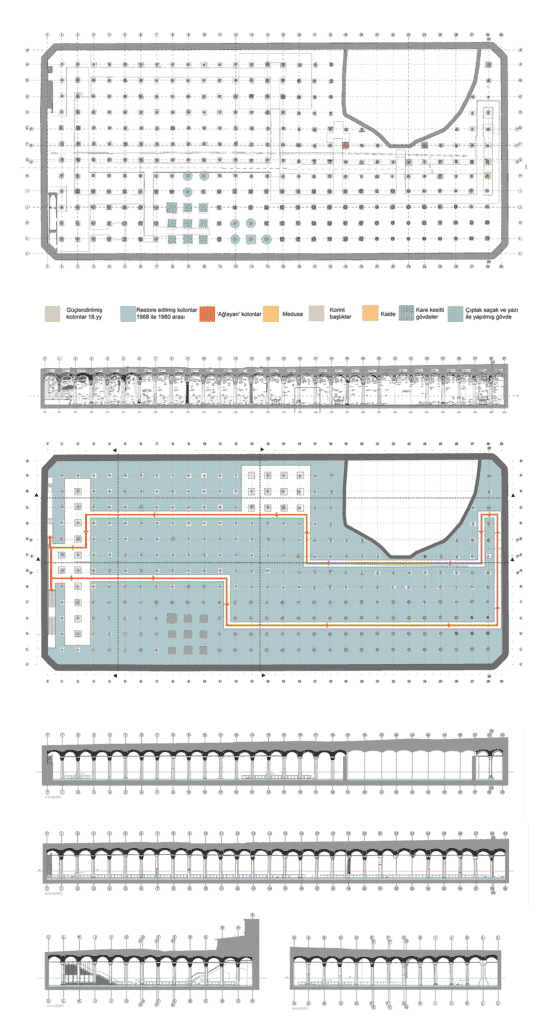 Yerebatan Sarnıcı Tarihi Yarımada’nın gezi rotasında oldukça önemli bir lokasyon olmasıyla da öne çıkıyor hatta verilere göre yapı, restorasyon öncesi İstanbul’da turistlerin en çok ziyaret ettiği üçüncü mekan konumundaydı. Böylesine önemli bir değerin gelecek nesillere sağlıklı bir şekilde aktarılabilmesini sağlamak hem şehrin eşsiz tarihinin hem de dünya mirasının korunması adına büyük önem taşıyor. Binlerce yıldır farklı katmanların üst üste eklenmesiyle oluşan İstanbul’un büyüleyici dokusunun 1500 yılı aşan kritik bir sürecine tanıklık etmesi, sarnıcı şehrin ayrılmaz bir parçası haline getiriyor. Bizans İmparatoru I. Justinianus (527-565) döneminde yaptırılan sarnıç, Ayasofya’nın güneybatısında konumlanmaktadır. Yerebatan Sarayı esasen yapının suyun içinden yükselen mermer sütunları sebebiyle yapıya halk tarafından verilen bir isimdir. Sarnıcın konumlandığı alanda daha öncesinde bir bazilika bulunmasından dolayı yapı, Bazilika Sarnıcı olarak da bilinir. Oldukça büyük bir ölçeğe sahip sarnıç, 70*140m ölçülerinde bir alan kaplıyor. Sarnıçta derin perspektifli etkileyici manzarayı oluşturan 9m yüksekliğinde tam 336 adet mermer sütun bulunuyor. Aralarında 4.80m mesafe bulunacak şekilde yerleştirilen bu sütunlar her bir sırada 28 sütun olacak şekilde toplamda 12 sıradan oluşuyor. 100.000 ton su depolama kapasitesine sahip dev sarnıcın Bizans döneminde Büyük Saray’ın ve bölgenin bir bölümünün su ihtiyacını karşılamak için kullanıldığı tahmin ediliyor.