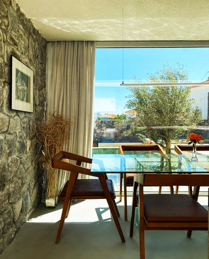 Avludaki yansıtıcı havuz ve cam açıklıklar, iç ve dış mekanı bir bütün olarak algılamamızı sağlıyor. Taş binanın bu denli şeffaf ve geçirgen oluşu ile gün ışığı ve doğa sesleri iç mekana da sızıyor. Böylece farklı zaman dilimlerinde her seferinde ve her karede kullanıcısına farklı deneyimler sunuyor.